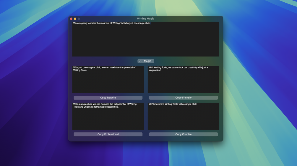 Introducing Writing Magic! With just one click, it applies the writing options of Writing Tools to your text: